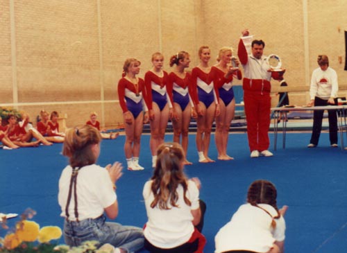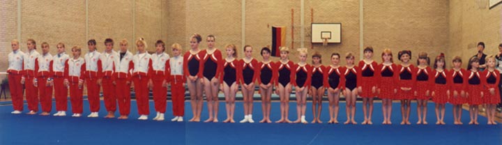 Visit of the German Club from Heilbronn. Note the skirts attached to the leotards on the younger gymnasts.